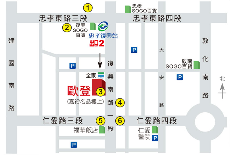 高速公路 (中山高) 下建國北路交流道 高架匝道往南於忠孝東路下平面車道左轉直行 復興南路交叉口右轉往仁愛路方向 第一個紅綠燈靠右 公車站牌前/嘉裕名品樓上。